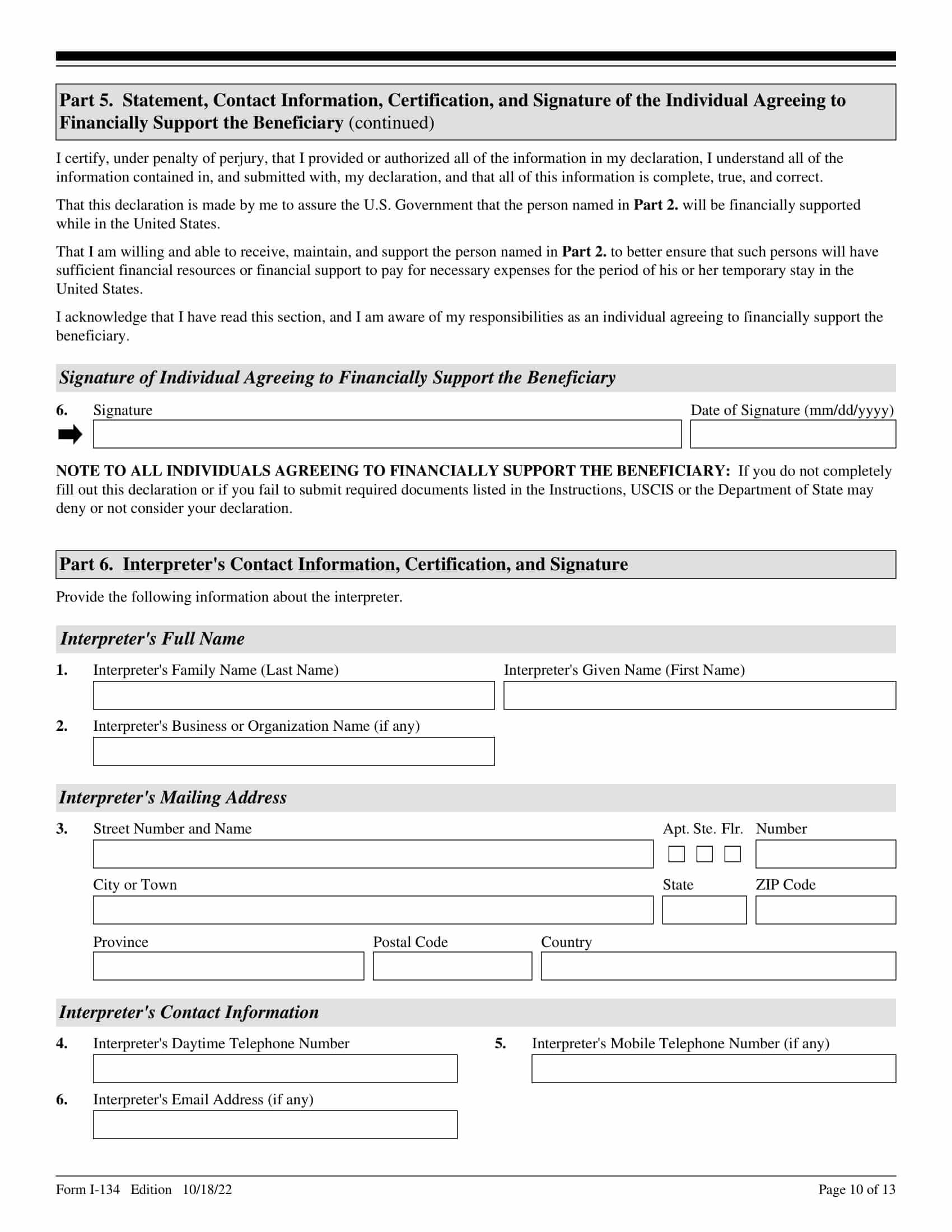 - I-134 的第一部分专门介绍申请人的个人信息。 您需要提供您的全名、出生日期、出生地点、地址和联系信息。