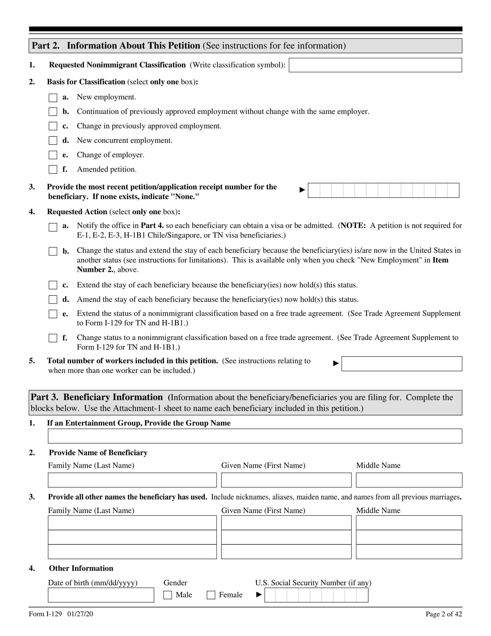 Employers use the I-129 form to request a permission for alien workers to enter the USA on a temporary basis in order to work, render services or undergo training under the following nonimmigrant categories: H-1B, H-1C, H-2A, H-2B, H-3, L-1, O-1, O-2, P-1, P-1S, P-2, P-2S, P-3, P-3S, Q-1 or R-1. Extending the period of staying in the country, as well as changing the employees’ status to nonimmigrant categories E-1, E-2 or TN can be other lawful reasons to use the form.